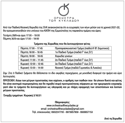 Ανακοίνωση εγγραφών από τη Ορχήστρα των Κυκλάδων Κείμενο Βλέπε εικόνα. Αριθμός Φύλλου: 5717 Κατηγορία: Ανακοίνωση