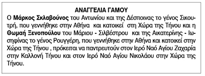 Αναγγελία Γάμου Μάρκου Σκλαβούνου και Θωμαής Ξενοπούλου Κείμενο Βλέπε εικόνα. Αριθμός Φύλλου: 5718 Κατηγορία: Αναγγελία Γάμου