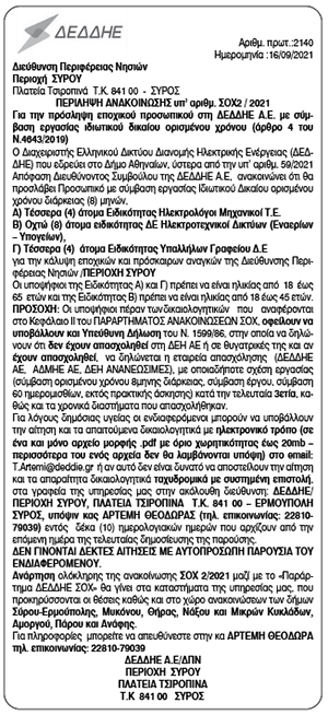 Περίληψη ανακοίνωσης υπ' αριθμ. ΣΟΧ2/2021 απο ΔΕΔΔΗΕ Α.Ε.για πρόσληψη εποχικού προσωπικού. Κείμενο Βλέπε εικόνα. Αριθμός Φύλλου: 5723 Κατηγορία: Προκήρυξη Θέσεων