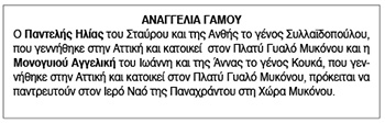 Αναγγελία Γάμου Παντελή Ηλία και Μονογυιού Αγγελικής Κείμενο Βλέπε εικόνα. Αριθμός Φύλλου: 5725 Κατηγορία: Αναγγελία Γάμου