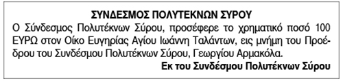 Δωρεά στον Οίκο Ευγηρίας Αγίου Ιωάννη Ταλάντων εις μνήμη Γεωργίου Αρμακόλα Κείμενο Βλέπε εικόνα. Αριθμός Φύλλου: 5730 Κατηγορία: Δωρεές
