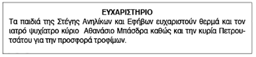 Ευχαριστήριο από τη Στέγη Ανηλίκων και Εφήβων Κείμενο Βλέπε εικόνα. Αριθμός Φύλλου: 5747 Κατηγορία: Ευχαριστήριο