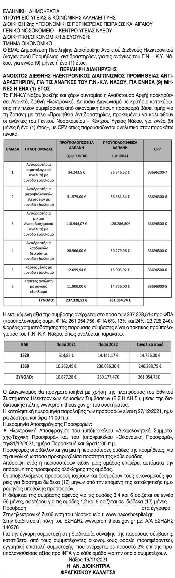 Προμήθειας Αντιδραστηρίων, για τις ανάγκες του Γ.Ν. – Κ.Υ. ΝΑΞΟΥ, για εννέα (9) μήνες ή ένα (1) έτος Κείμενο Βλέπε εικόνα. Αριθμός Φύλλου: 5760 Κατηγορία: Προκήρυξη Έργων - Δημοπρασίες