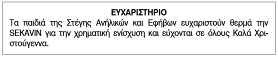Ευχαριστήριο από την Στέγη Ανηλίκων και Εφήβων Κείμενο Βλέπε εικόνα. Αριθμός Φύλλου: 5769 Κατηγορία: Ευχαριστήριο