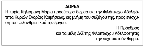Δωρεές στην Φιλόπτωχο Αδελφότητα Κυριών Ενορίας Κοιμήσεως Κείμενο Βλέπε εικόνα.Φ Αριθμός Φύλλου: 5776 Κατηγορία: Δωρεές