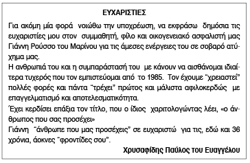 Ευχαριστήριο από κύριο Χρυσαφίδη Παύλο προς κύριο Ρούσσο Ιωάννη Κείμενο Βλέπε εικόνα. Αριθμός Φύλλου: 5782 Κατηγορία: Ευχαριστήριο