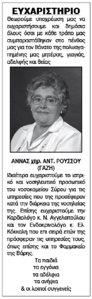 Ευχαριστήριο Άννας χήρας Αντ. Ρούσσου Κείμενο Βλέπε εικόνα. Αριθμός Φύλλου: Αριθμός Φύλλου 5784 Κατηγορία: Κατηγορία Ευχαριστήριο