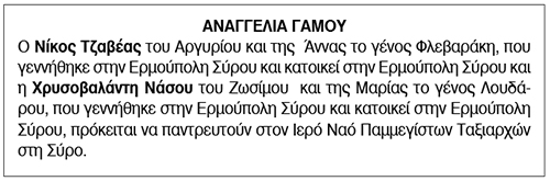 Αναγγελία Γάμου Τζαβέα Νίκου και Νάσου Χρυσοβαλάντης Κείμενο Βλέπε εικόνα. Αριθμός Φύλλου: 5793 Κατηγορία: Αναγγελία Γάμου