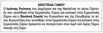 Αναγγελία Γάμου Ρούσσου Ιωάννη και Βασιλικής Στρατή Κείμενο Βλέπε εικόνα. Αριθμός Φύλλου: 5795 Κατηγορία: Αναγγελία Γάμου