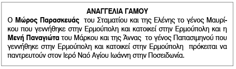 Αναγγελία Γάμου Μώρου Παρασκευά και Μενή Παναγιώτας Κείμενο Βλέπε εικόνα. Αριθμός Φύλλου: 5801 Κατηγορία: Αναγγελία Γάμου