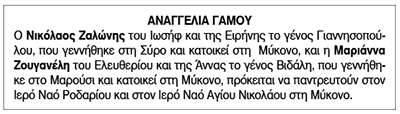 Αναγγελία Γάμου για Νικόλαο Ζαλώνη και Μαριάννα Ζουγανέλη Κείμενο Βλέπε εικόνα. Αριθμός Φύλλου: 5808 Κατηγορία: Αναγγελία Γάμου