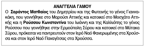 Αναγγελία Γάμου Σαράντου Ματθαίου και Ρούσσου Κωνσταντίνας Κείμενο Βλέπε εικόνα. Αριθμός Φύλλου: 5811 Κατηγορία: Αναγγελία Γάμου
