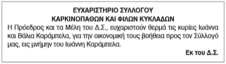 Ευχαριστήριο Καρκινοπαθών και Φίλων Κυκλάδων Κείμενο Βλέπε εικόνα. Αριθμός Φύλλου: Αριθμός Φύλλου 5813 Κατηγορία: Κατηγορία Ευχαριστήριο