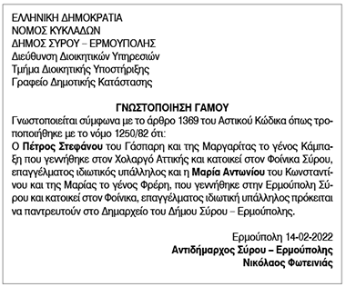 Γνωστοποίηση Γάμου Στεφάνου Πέτρου και Αντωνίου Μαρίας Κείμενο Βλέπε εικόνα Αριθμός Φύλλου: 5815 Κατηγορία: Γνωστοποίηση Γάμου