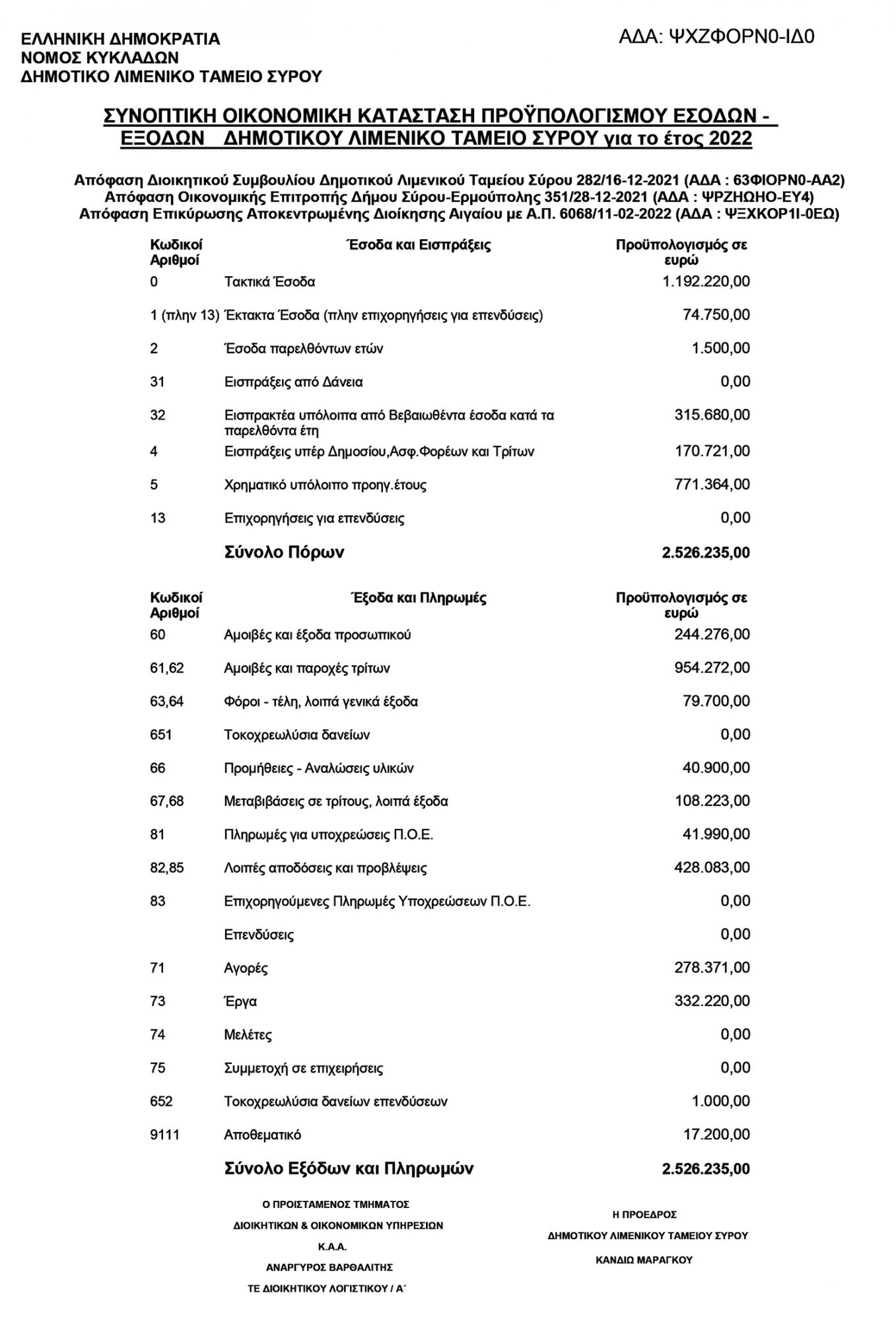 Συνοπτική Οικονομική Κατάσταση Προϋπολογισμού Εσόδων-Εξόδων ΔΛΤ Σύρου για το έτος 2022 Κείμενο Βλέπε εικόνα Αριθμός Φύλλου: Αριθμός Φύλλου 5818 Κατηγορία: Κατηγορία Προϋπολογισμοί