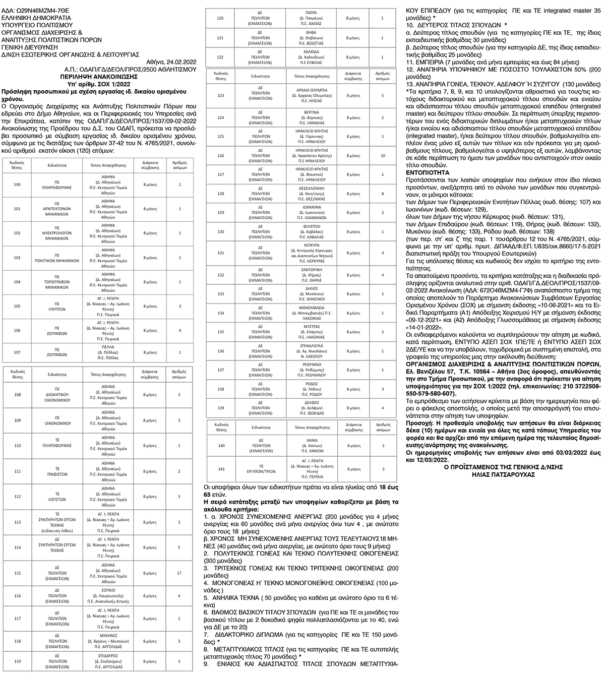 Δημοσίευση Περίληψης Ανακοίνωσης ΣΟΧ1/2022 του ΟΠΑΔ Κείμενο Βλέπε εικόνα. Αριθμός Φύλλου: 5825 Κατηγορία: Προκήρυξη Θέσεων