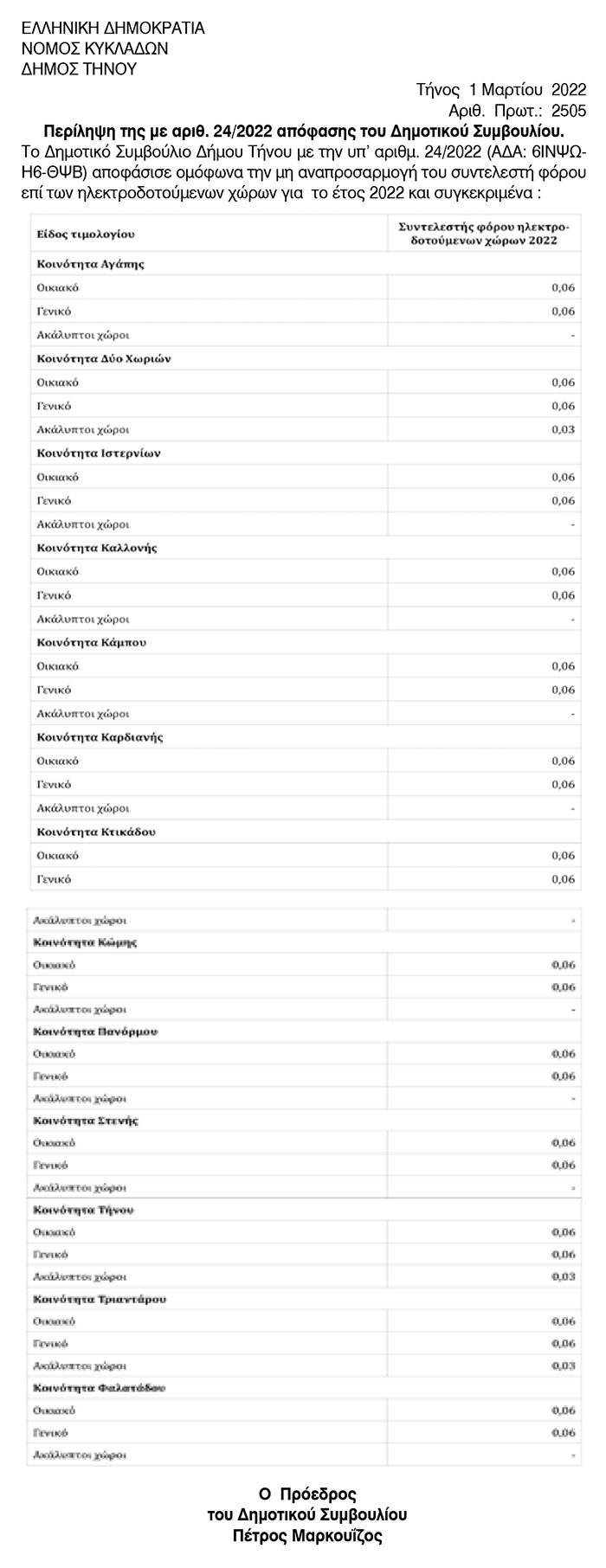 Περίληψη της με αρ. 24/2022 απόφαση του Δημοτικού Συμβουλίου μη αναπροσαρμογή συντελεστή φόρου ηλεκτροδοτούμενων χώρων 2022 του Δήμου Τήνου Κείμενο Βλέπε εικόνα Αριθμός Φύλλου: Αριθμός Φύλλου 5827 Κατηγορία: Κατηγορία Περιλήψεις
