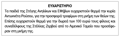 Ευχαριστήριο από την Στέγη Ανηλίκων και Εφήβων Σύρου Κείμενο Βλέπε εικόνα. Αριθμός Φύλλου: 5832 Κατηγορία: Ευχαριστήριο