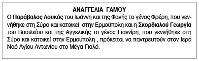 Αναγγελία Γάμου Παράβαλου Λουκά και Σκορδιαλού Γεωργίας Κείμενο Βλέπε εικόνα. Αριθμός Φύλλου: 5834 Κατηγορία: Αναγγελία Γάμου