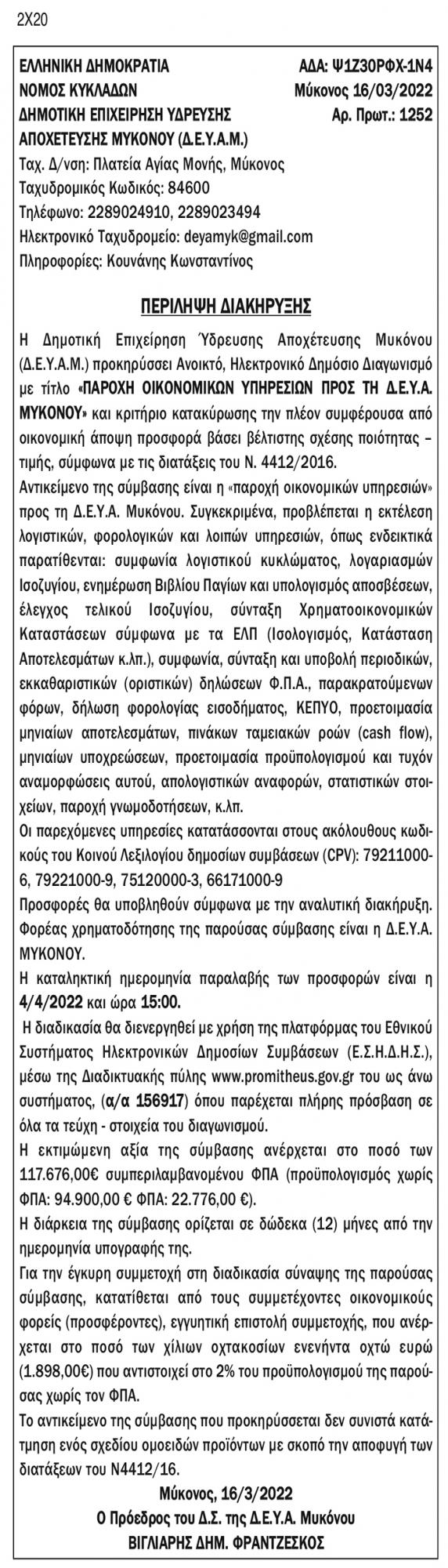 Παροχή οικονομικών υπηρεσιών προς τη Δ.Ε.Υ. Μυκόνου Κείμενο Βλέπε εικόνα. Αριθμός Φύλλου: Αριθμός Φύλλου 5836 Κατηγορία: Κατηγορία Προκήρυξη Θέσεων