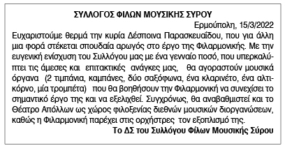Ευγενική ενίσχυση του Συλλόγου Φίλων Μουσικής Σύρου Κείμενο Βλέπε εικόνα. Αριθμός Φύλλου: 5836 Κατηγορία: Ευχαριστήριο