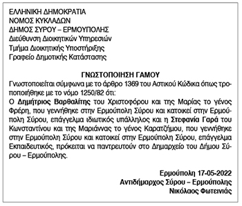 Γνωστοποίηση Γάμου Δημητρίου Βαρθαλίτη και Στεφανίας Γαρά Κείμενο Βλέπε εικόνα. Αριθμός Φύλλου: 5839 Κατηγορία: Γνωστοποίηση Γάμου