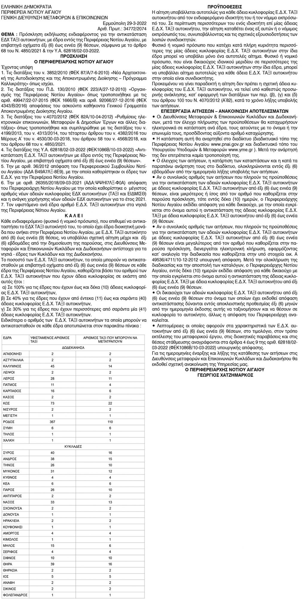 Πρόσκληση εκδήλωσης ενδιαφέροντος για την αντικατάσταση ΕΔΧ ΤΑΞΙ αυτοκινήτων, με έδρα εντός της Περιφέρειας Νοτίου Αιγαίου, με επιβατηγά οχήματα 6 έως 9 θέσεων, από την Περιφέρεια Νοτίου Αιγαίου