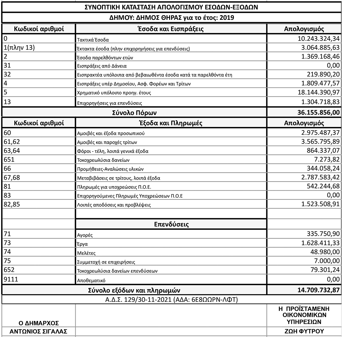 Συνοπτική Κατάσταση Απολογισμού Εσόδων - Εξόδων Δήμου Θήρας για το έτος: 2019 Κείμενο Βλέπε εικόνα. Αριθμός Φύλλου: Αριθμός Φύλλου 5850 Κατηγορία: Κατηγορία Απολογισμός