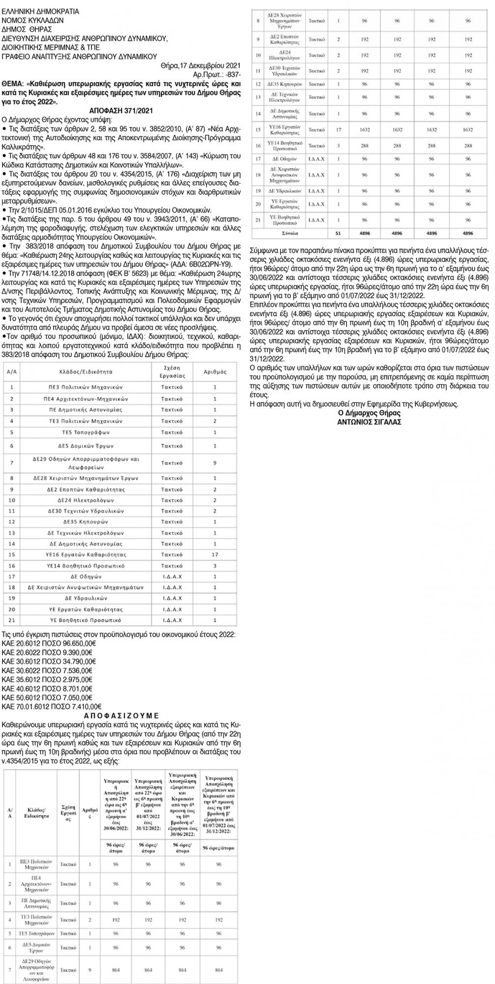 Καθιέρωση υπερωριακής εργασίας κατά τις νυχτερινές ώρες και κατά τις Κυριακές και εξαιρέσιμες ημέρες των υπηρεσιών του Δήμου Θήρας για το έτος 2022 Κείμενο Βλέπε εικόνα. Αριθμός Φύλλου: Αριθμός Φύλλου 5850 Κατηγορία: Κατηγορία Απόφαση