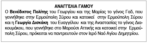 Αναγγελία Γάμου για Βενέδικτο Πολίτη και Γεωργία Δισκάκη Κείμενο Βλέπε εικόνα. Αριθμός Φύλλου: 5853 Κατηγορία: Αναγγελία Γάμου