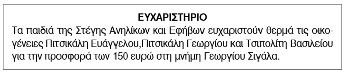 Ευχαριστήριο από τη Στέγη Ανηλίκων και Εφήβων Σύρου Κείμενο Βλέπε εικόνα. Αριθμός Φύλλου: 5855 Κατηγορία: Ευχαριστήριο
