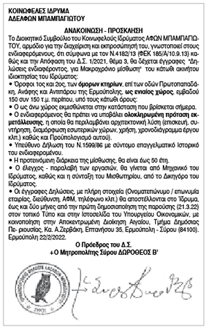 Απόφαση του Δ.Σ. 1/2021 από το Κοινωφελές Ίδρυμα Αδελφών Μπαμπαγιώτου για έγγραφες δηλώσεις ενδιαφέροντος για μακροχρόνια μίσθωση ακινήτου. Κείμενο Βλέπε εικόνα. Αριθμός Φύλλου: Αριθμός Φύλλου 5862 Κατηγορία: Κατηγορία Ανακοίνωση