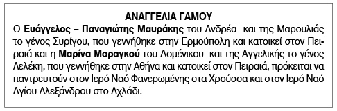 Αναγγελία Γάμου Ευάγγελου - Παναγιώτη Μαυράκη και Μαρίνας Μαραγκού Κείμενο Βλέπε εικόνα. Αριθμός Φύλλου: 5863 Κατηγορία: Αναγγελία Γάμου