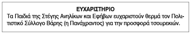 Ευχαριστήριο από τη Στέγη Ανηλίκων και Εφήβων Κείμενο Βλέπε εικόνα. Αριθμός Φύλλου: 5864 Κατηγορία: Ευχαριστήριο