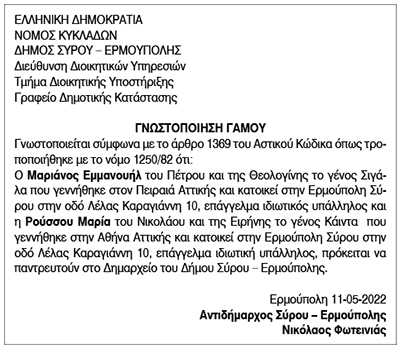 Γνωστοποίηση Γάμου Μαριάνου Εμμανουήλ και Ρούσσου Μαρίας Κείμενο Βλέπε εικόνα. Αριθμός Φύλλου: 5873 Κατηγορία: Γνωστοποίηση Γάμου