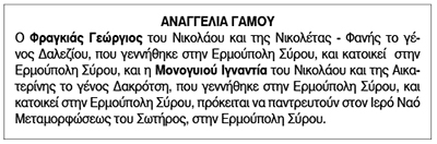 Αναγγελία Γάμου Φραγκιά Γεώργιου και Μονογυιού Ιγνατίας Κείμενο Βλέπε εικόνα. Αριθμός Φύλλου: 5874 Κατηγορία: Αναγγελία Γάμου