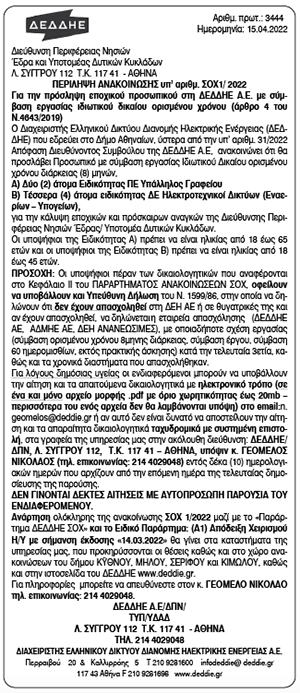 Περίληψη Ανακοίνωσης υπ' αιθμ. ΣΟΧ 1/2022 από την ΔΕΔΔΗΕ Κείμενο Βλέπε εικόνα. Αριθμός Φύλλου: 5874 Κατηγορία: Προκήρυξη Θέσεων