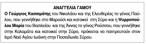 Αναγγελία Γάμου Γεώργιου Κασσιμάτη και Μαρίας Κείμενο Βλέπε εικόνα. Αριθμός Φύλλου: 5875 Κατηγορία: Αναγγελία Γάμου