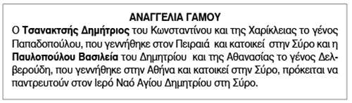 Αναγγελία Γάμου Τσανακτσή Δημήτρη και Παυλοπούλου Βασιλείας Κείμενο Βλέπε εικόνα. Αριθμός Φύλλου: 5876 Κατηγορία: Αναγγελία Γάμου