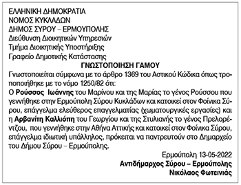 Γνωστοποίηση Γάμου Ρούσσου Ιωάννη και Αρβανίτη Καλλιόπης Κείμενο Βλέπε εικόνα. Αριθμός Φύλλου: 5876 Κατηγορία: Γνωστοποίηση Γάμου