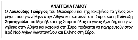 Αναγγελία Γάμου Λουλούδη Γεωργίου και Πρίντεζη Στρατηγούλας Κείμενο Βλέπε εικόνα. Αριθμός Φύλλου: 5878 Κατηγορία: Αναγγελία Γάμου