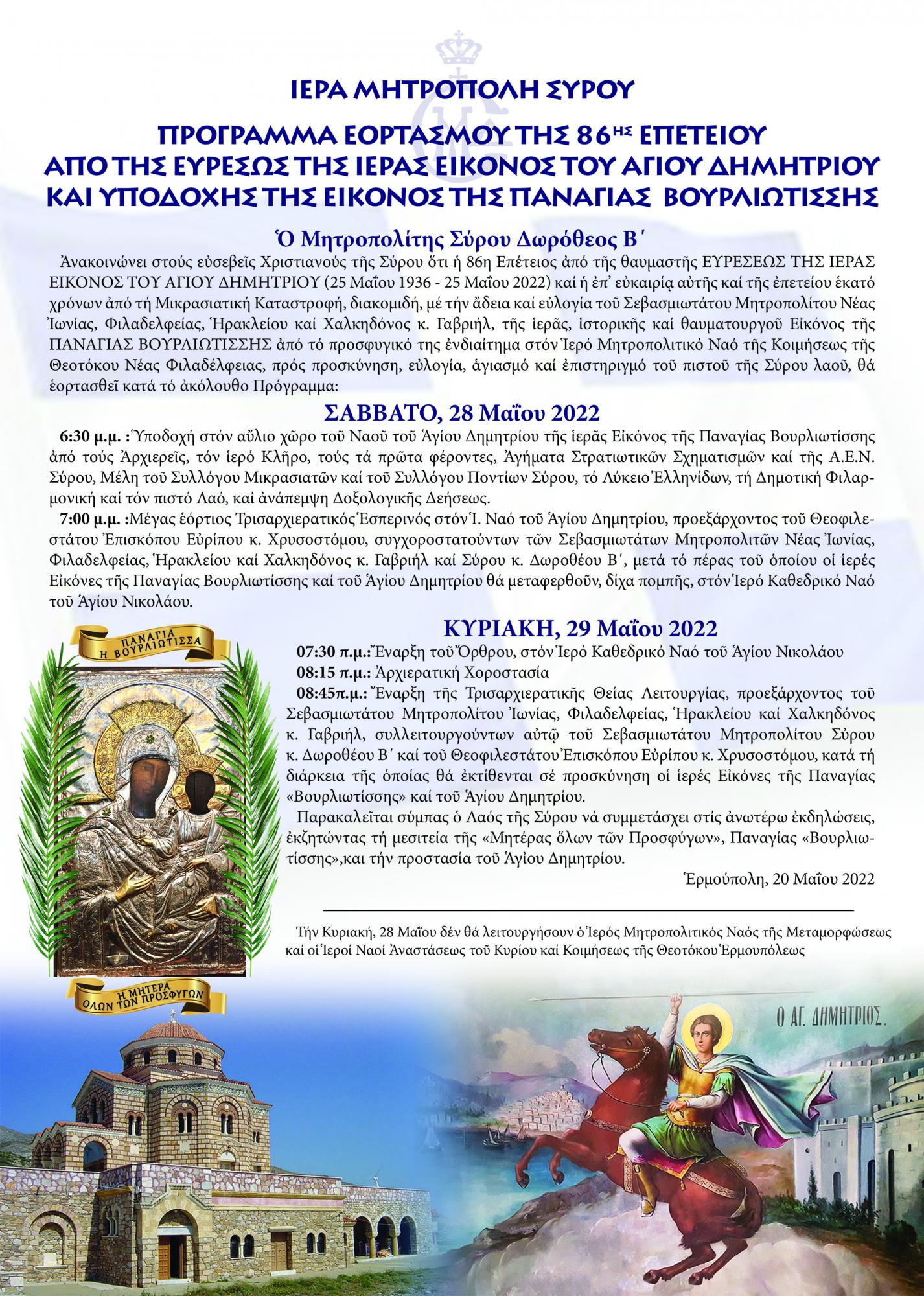 Πρόγραμμα Εορτασμού 86ης Επετείου από της Ευρέσεως της Ιεράς Εικόνος του Αγίου Δημητρίου και υποδοχής της Εικόνος της Παναγίας Βουρλιωτίσσης, από την Ιερά Μητρόπολη Σύρου