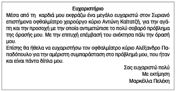 Ευχαριστήριο από κυρία Μαρκέλλα Πελέκη προς ιατρούς Κείμενο Βλέπε εικόνα. Αριθμός Φύλλου: 5884 Κατηγορία: Ευχαριστήριο