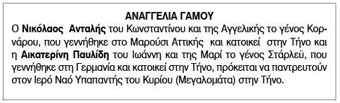 Αναγγελία Γάμου Ανταλή Νικολάου και Παυλίδη Αικατερίνης Κείμενο Βλέπε εικόνα. Αριθμός Φύλλου: 5885 Κατηγορία: Αναγγελία Γάμου