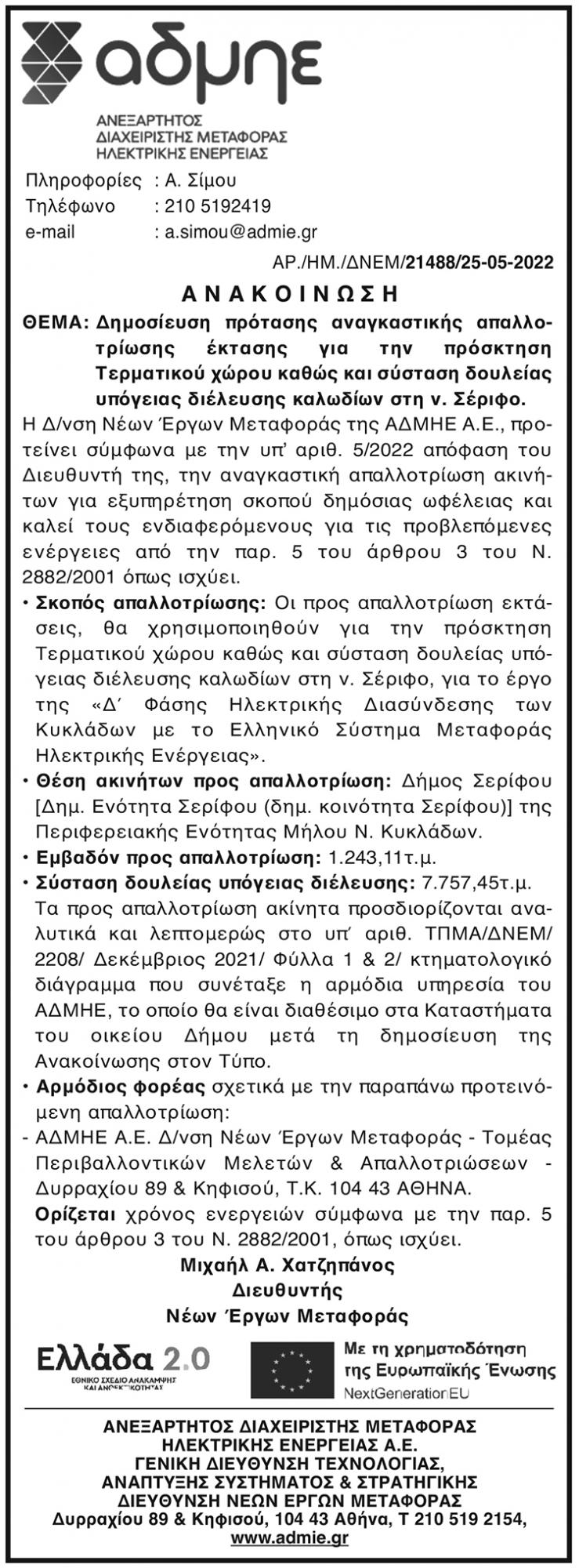 Πρότασης αναγκαστικής απαλλοτρίωσης έκτασης για την πρόστηση Τερματικού χώρου καθώς και σύσταση δουλείας υπόγειας διέλευσης καλωδίων στη ν. Σέριφο Κείμενο Βλέπε εικόνα. Αριθμός Φύλλου: Αριθμός Φύλλου 5887 Κατηγορία: Κατηγορία Προκήρυξη Έργων - Δημοπρασίες