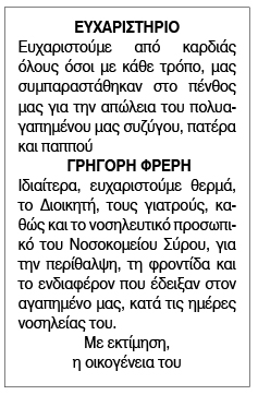 Ευχαριστήριο για Φρέρη Γρηγόρη