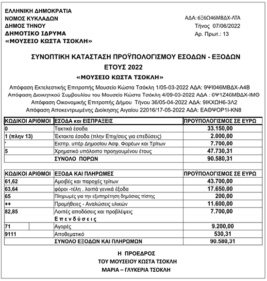 Συνοπτική Κατάσταση Προϋπολογισμού Εσόδων - Εξόδων έτους 2022 από "Μουσείο Κώστα Τσόκλη" Κείμενο Βλέπε εικόνα. Αριθμός Φύλλου: Αριθμός Φύλλου 5891 Κατηγορία: Κατηγορία Προϋπολογισμοί