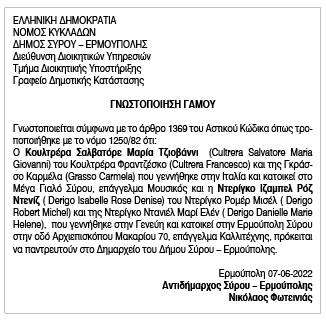 Γνωστοποίηση Γάμου Κουλτρέρα Σαλβατόρε και Ντερίγκο Ιζαμπελ Κείμενο Βλέπε εικόνα. Αριθμός Φύλλου: 5892 Κατηγορία: Γνωστοποίηση Γάμου