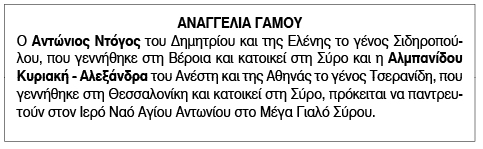 Αναγγελία Γάμου Αντωνίου Ντόγου και Κυριακής - Αλεξάνδρας Αλμπανίδου Κείμενο Βλέπε εικόνα. Αριθμός Φύλλου: 5893 Κατηγορία: Αναγγελία Γάμου