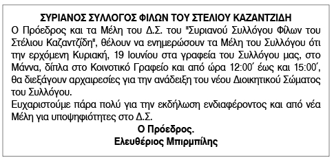 Ενημέρωση για την διεξαγωγή αρχαιρεσιών του Συριανού Συλλόγου Φίλων του Στέλιου Καζαντζίδη Κείμενο Βλέπε εικόνα. Αριθμός Φύλλου: 5895 Κατηγορία: Ανακοίνωση